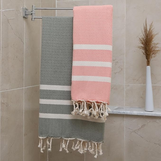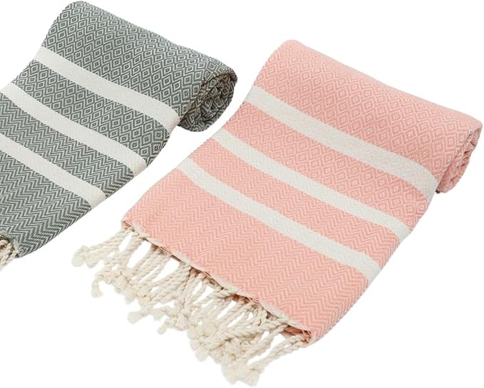 2 Pack Travel Cotton Blanket Twin Size Breathable Cozy Airplane Keep Warm Compact Vacation Essentials Car Camping Quick Dry Beach Peshtemal Towel (Khaki Green and Salmon Pink)