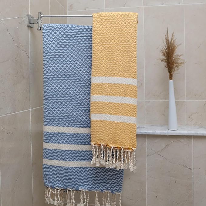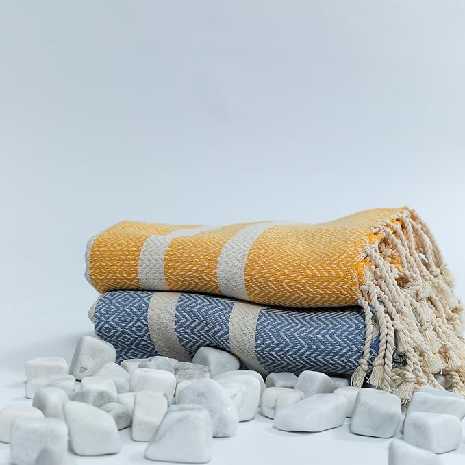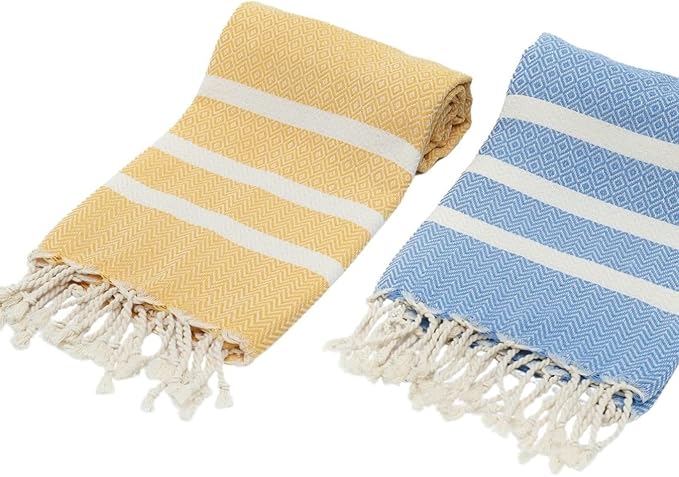 2 Pack Cotton Oversized Beach Towel Turkish Peshtemal Quick Dry Absorbent Lightweight Washable Sand Free Swim Pool Camp Travel Breathable Cozy Blanket (Gold Yellow and Turquoise Blue)