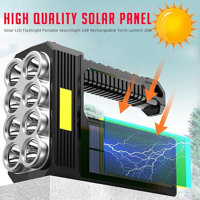 - 🔦SOLAR CHARGE/USB CHARGE: Solar Charge: Equipped with solar panels, as long as there is weak sunlight, it can be quickly charged at any time. USB Charge: There is an Android USB charging port on the side of the flashlight, which can be connected to a computer, car and power outlet.
