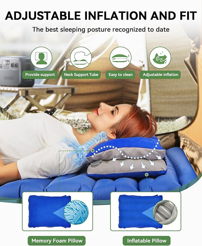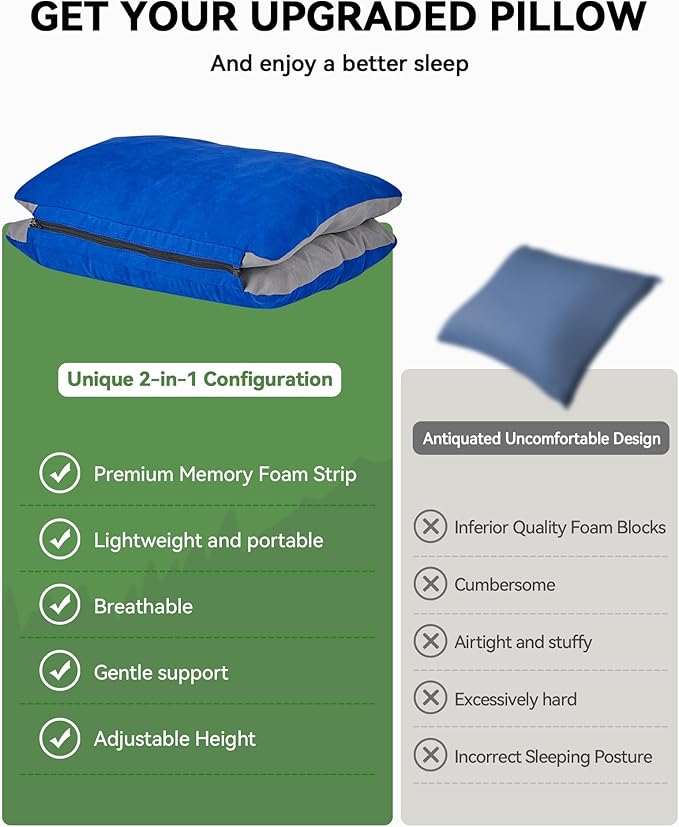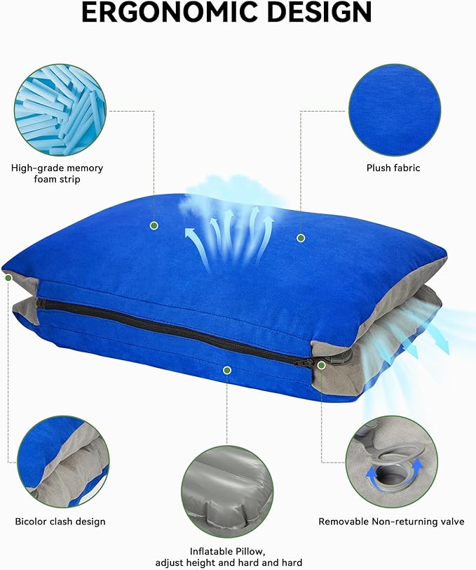 - 【Dual Innovation】Our outdoor pillow showcases a durable airtight PVC bladder and Inner Memory Foam, assuring airtight integrity thanks to its refined construction. Setting it apart from standard choices, our pillow features a distinct bladder crafted from reinforced PVC material, meticulously validated through nearly 1,000 quality assessments. We pledge a 100% SATISFACTION GUARANTEE in the event of any shortfall in meeting your expectations.