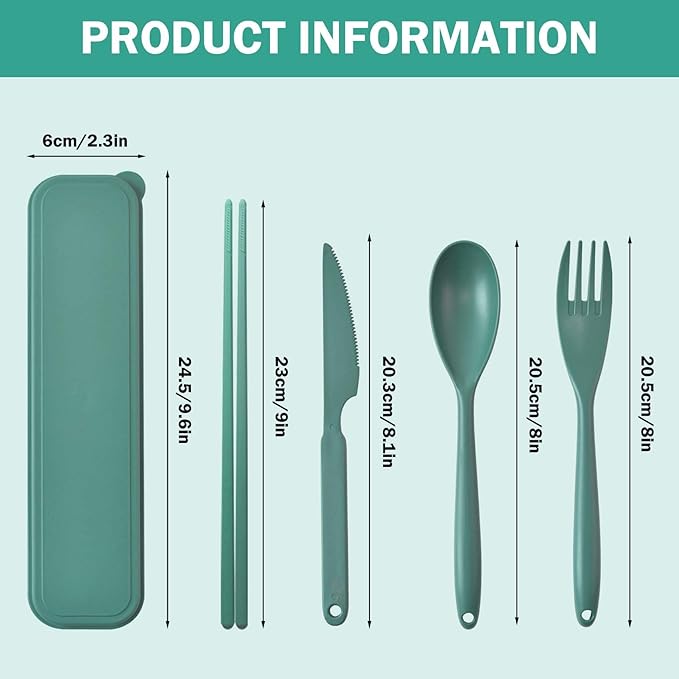- 【Reusable Cutlery Set with Case】 Portable cutlery set is included one fork, one spoon, chopsticks, and one knife.The size of the case is 9 inches, and the size of the knife, forks and spoons are both 8 inches, chopsticks is 9inch.
