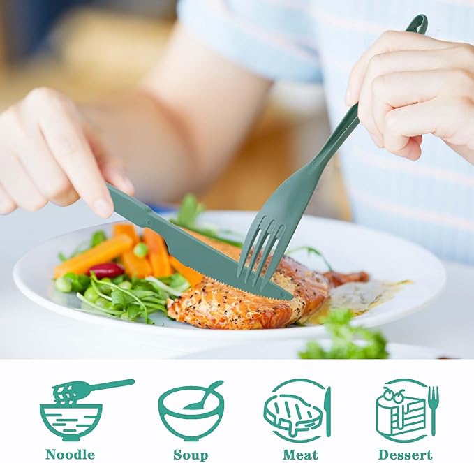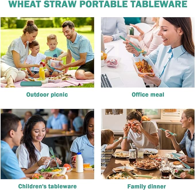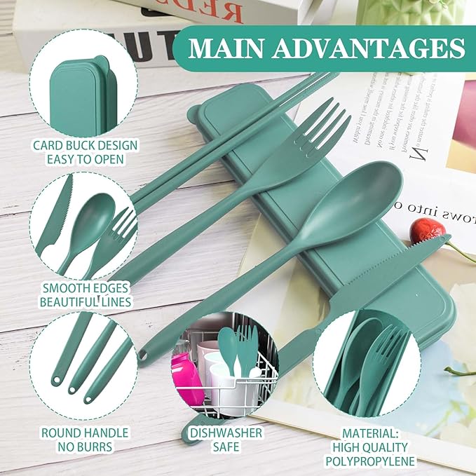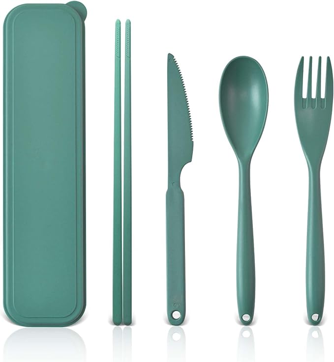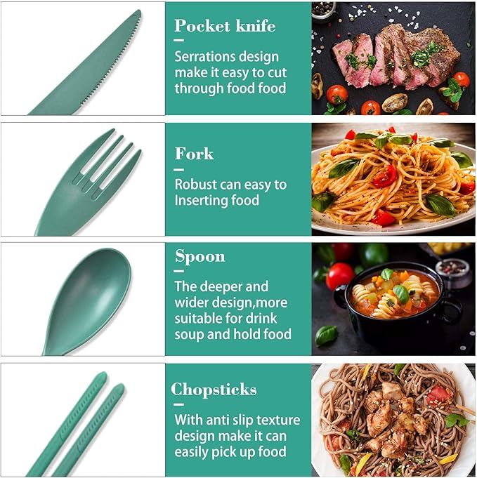 - 【Material and Portability】Our travel utensils are made of high quality plastic and reusable. Traditional stainless steel cutlery is too heavy and difficult to carry. Our colorful sets of flatware sets are small and lightweight for easy portability.