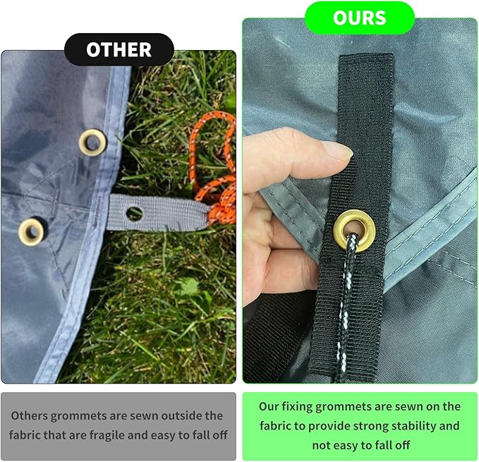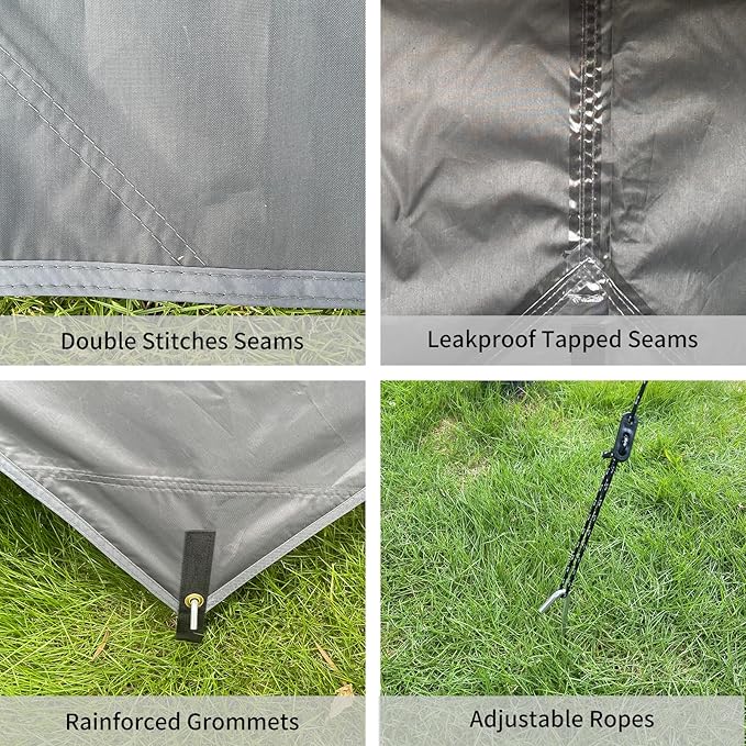 - ✯𝐏𝐫𝐞𝐦𝐢𝐮𝐦 𝐌𝐚𝐭𝐞𝐫𝐢𝐚𝐥 - Our lightweight camping tarp is made of 210T ripstop polyester fabric with 3000mm PU Waterproof, which is durable and tear-resistant. The fixing grommets are sewn on the fabric, making it more sturdy and will not easily to fall off. The double stitching process will enhance the stability of the connector and effectively prevent it from falling off.