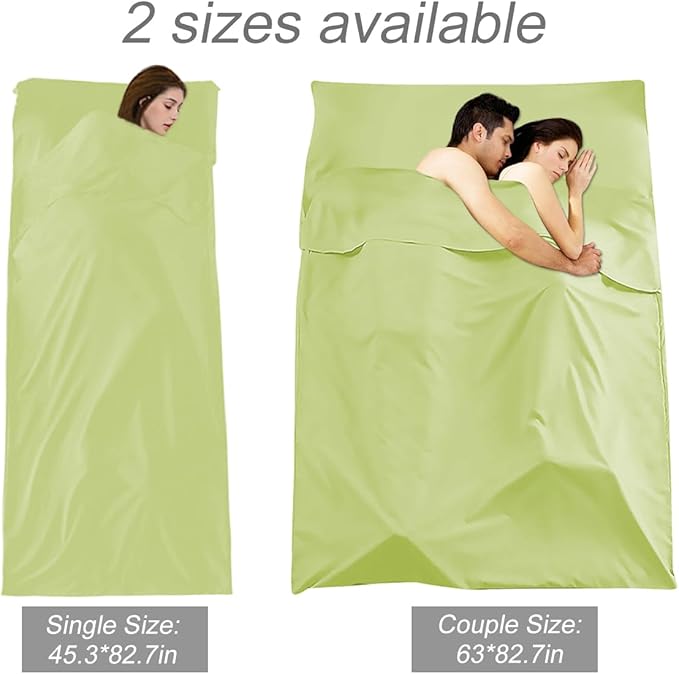 - ✅【PERFECT SIZES 】- 45 x 82.7inch(115 x 210cm) fits for single; 63 x 82.7inch(160 x 210cm) fits for strong single people or couples ; 70 x 82.7inch(180 x 210cm) fits for double. All size are large enough to stretch arms and legs. This Lightweight Portable Sleeping Bag Liner and Camping Sheet can be fold down in a about 8.3 X8.3 inch pocket for easy carry and saving pace in your backpack.