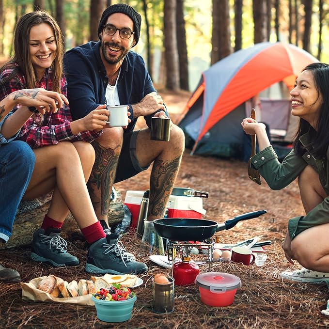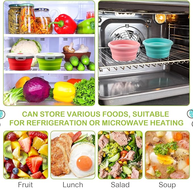 - Microwave, Fridge and Dishwasher Safe: these collapsible bowls with lids for camping accessories can heat in the microwave, or pour the rest of the food into the collapsible food storage containers with lids and put it in the fridge again; These collapsible kitchen items work as indoor and outdoor food storage containers, RV storage solutions, camping kitchen accessories, motorhome accessories for inside