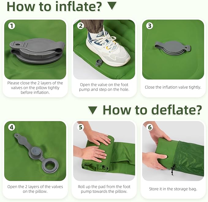 - Easy to Inflation: No more blowing your camping pad with your mouth! It has a built-in foot pump that allows you to inflate it by foot in 1 minute. You can adjust the firmness of the mat by adding or releasing air according to your preference