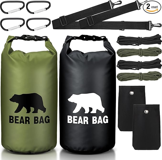 - Bear Food Bag Hanging System: includes 2 bear food bags respectively in black and army green, 4 sturdy nylon ropes in 2 colors, namely black and army green, 4 clips in black, and 2 rock pouches in black; The package ensures you have everything you need for a convenient and efficient setup