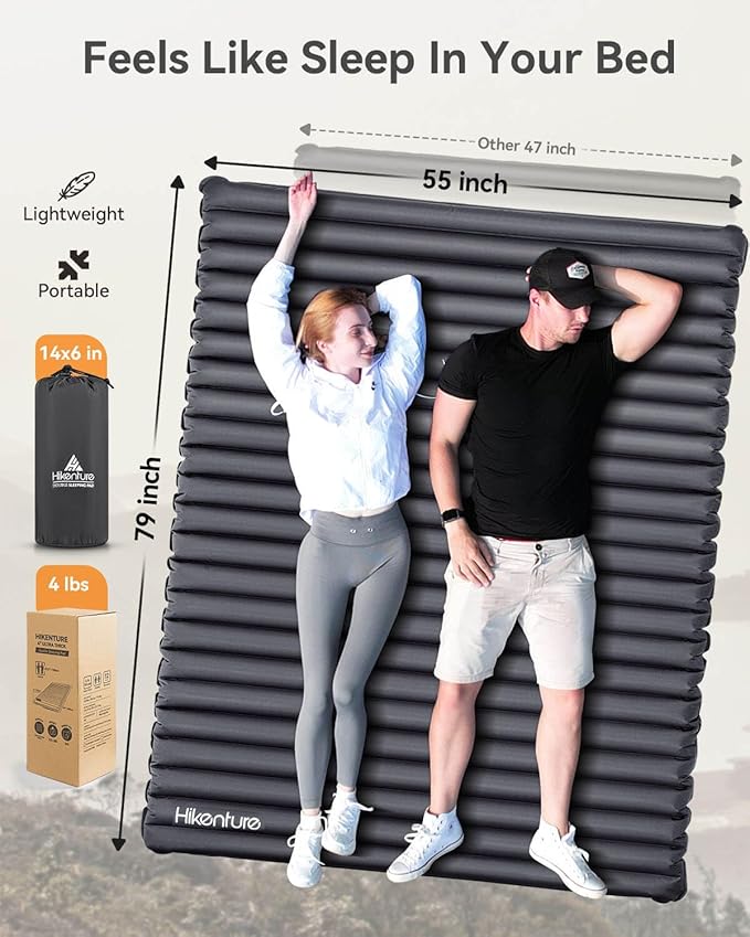 - Never Touch The Hard Ground: With 4 inches thickness, Hikenture camping mattress for 2 person offers a cozy and solid cushion and padding for side sleepers, back sleepers, or stomach sleepers, delivering bed-like comfort during your journey. The inflatable sleeping pad also provides ample space for you to turn over at will.