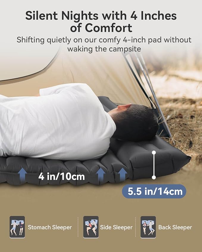 - Embrace Nature in Dreamy Comfort: Say goodbye to sore hips and back, and sleep soundly under the open sky. Hikenture Double Camping Mattress with built-in pillow can inflated to 79*55 inches - a perfect size for 2 very comfy adults. With a 4-inch cozy padding and body support adaptable to all terrains, this sleeping pad guarantees a rejuvenating sleep during your adventures.