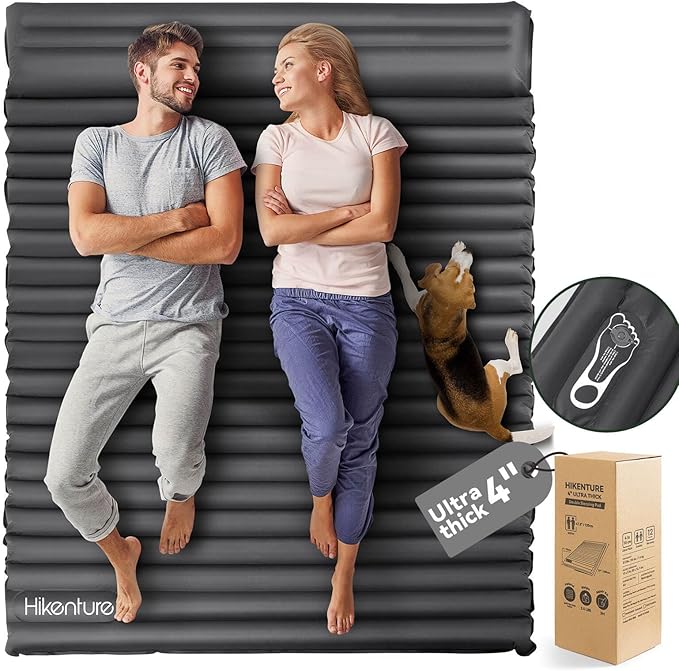 - Sleep Under The Stars in Big Comfort: Ideal for a restful slumber with your camping companion after an exhausting day of hiking, the Hikenture Double Camping Mattress is an essential for every outdoor enthusiast, with its effortless portability and setup. With a 4-inch cozy padding and body support adaptable to all terrains, this pad guarantees a rejuvenating sleep during your adventures.