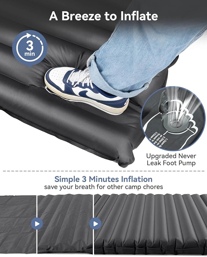 - A Breeze to Inflate / Deflate: Inflate the sleeping pad in 5 minutes with our built-in foot pump. Simply step on the foot pump, lift up, and then push down, keep the process until the pad full with air and you're good to go. Packing up is just as quick - release all the air and roll up the pad, and then put into the storage bag.