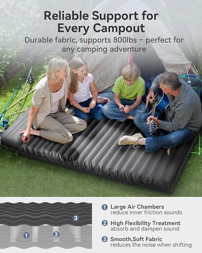 - Your Reliable Camping Companion: This inflatable sleeping pad features an unique I-beam air chamber design, reduces weight while providing multi-directional support for consistent stability and comfort. The outdoor-grade wear-resistant fabric can withstand up to 800 lbs, which can easily elevates your whole body off the ground, ensuring you a sound sleep in outdoors.