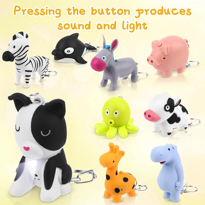 - 【LED LIGHT DESIGN】-There is a LED light embedded in the flashlight keychain, you can easily turn it on by press of the button and it can make a sound. Funny and convenient.(Notice: You should press the button for a little while, then it can make the complete animal sounds.)