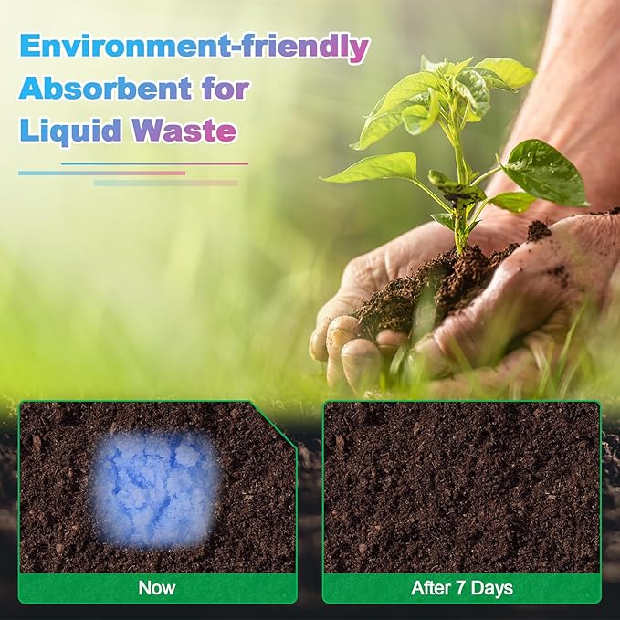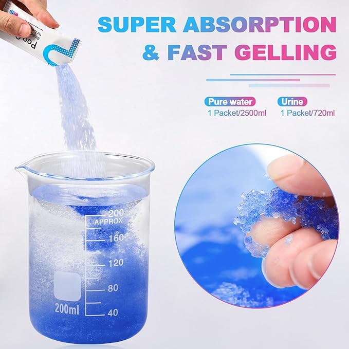 - Super Absorbent 2500 ML: Our toilet powder is made of SAP absorbent polymer, which can absorb urine, vomit, or other LIQUID waste. Each stick can instantly absorb 2500 ML pure water/720ml urine and turns into gel within Seconds
