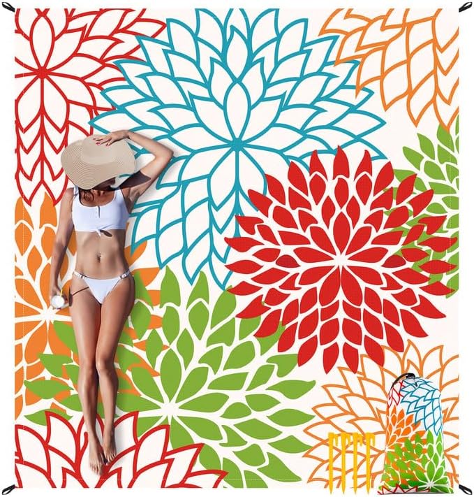 Large Beach Blanket Waterproof Sandproof, 78''×86'' Foldable Picnic Blankets for 4 Adults with Stakes and Sand Pocket, Colorful Blossoms Pattern Beach Mat Vacation Essentials Accessories Must Haves