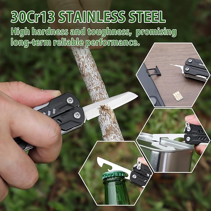 - SUPERIOR MATERIAL: This 11 in 1 EDC pocket tool is constructed 30Cr13 stainless steel, heat treated make it ultra tough and guarantees long-term durability. The hardness of principal function parts are higher than HRC50, with a strong cutting force and sharpness of durability, wear resistance.