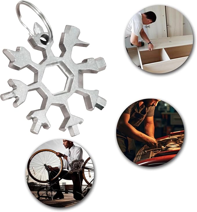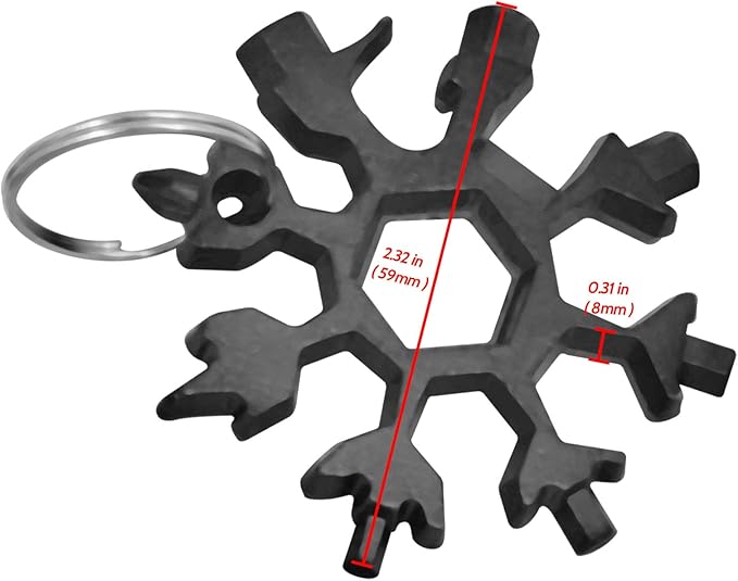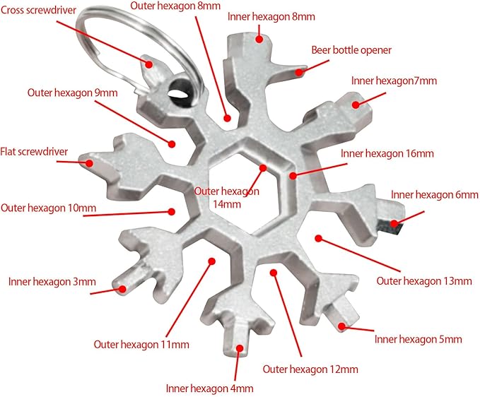 - [18-in-1 Multitool] The snowflake multifunctional tool has 18 types of tools, including hanging holes, flat screwdriver, cross screwdriver, beer bottle opener, 3, 4, 5, 6, 7, 8, 16mm internal hexagonal wrenches, 8, 9, 10, 11, 12, 13, 14mm external hexagonal wrenches.