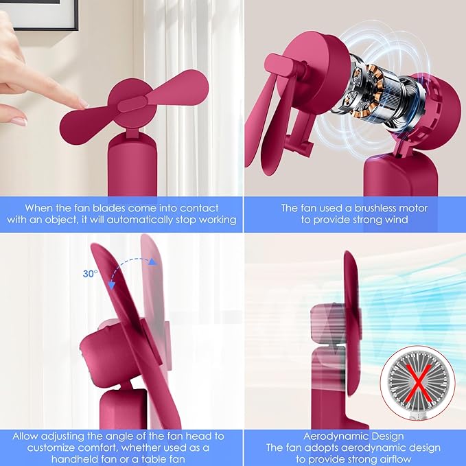 - 【Adjustable direction of wind】Whether you are using it as a handheld fan or a mini desktop fan, the angle of the fan head can be adjusted upwards. When you use it as a desktop fan, adjust the angle of the fan head upwards to allow strong winds to blow onto your face. When you use it as a handheld fan, you don't need to hold your hands high, just adjust the angle of the fan head upwards and let the strong wind blow onto your face, which will make you more comfortable to use.