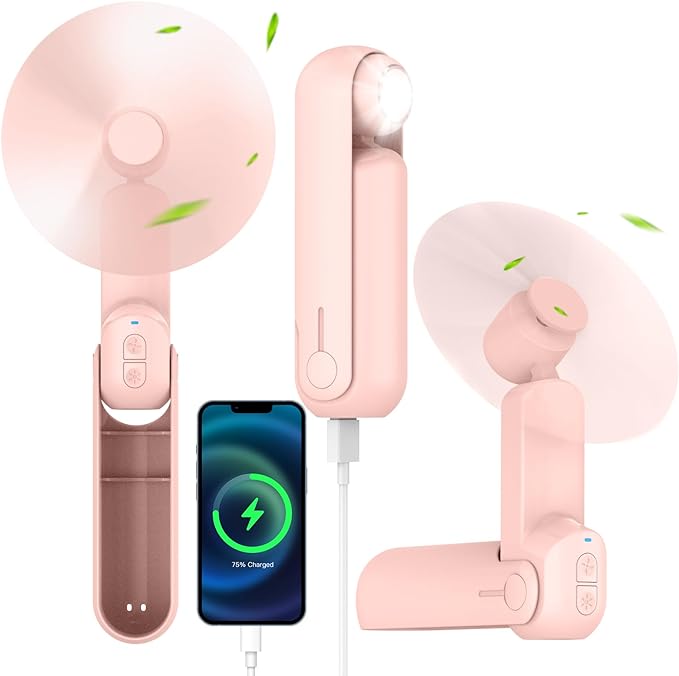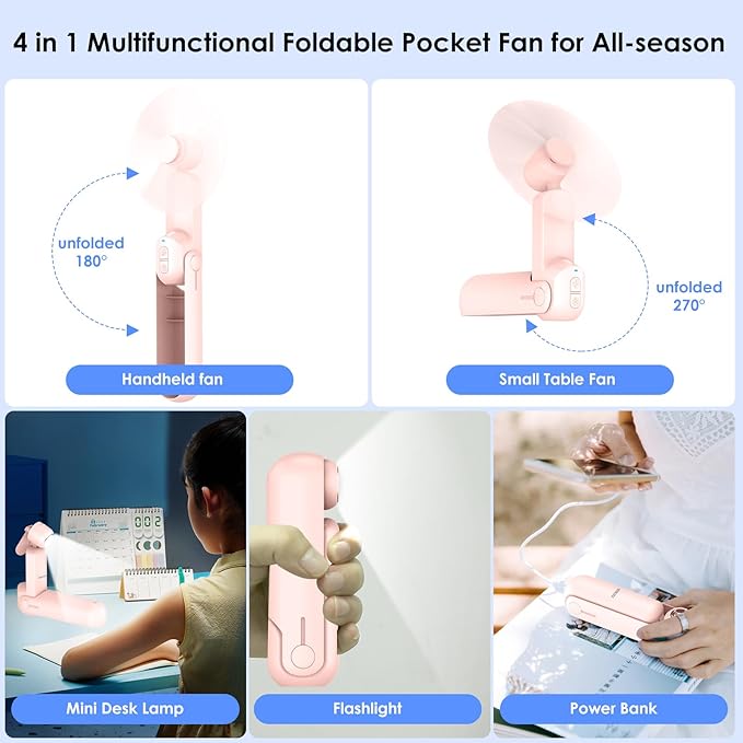 4 IN 1 Portable Handheld Fan,Personal Foldable Cooling Fan, Mini Pocket Fan,Desk Fan,Hand Fan,Flashlight,Power Bank,Table Lamp,Camping Travel Beach Fan, Birthday Gifts for Women Men(Pink)