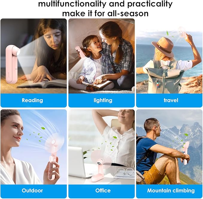 - 【4-in-1 Handheld fan】This 4 in 1 multifunctional handheld fan can be used as a power bank, flashlight, small desktop fan, and mini desk lamp. The aerodynamic design allows it to provide stronger wind,the folding design makes it very fashionable and easy to carry,it's a must-have for both home and travel.