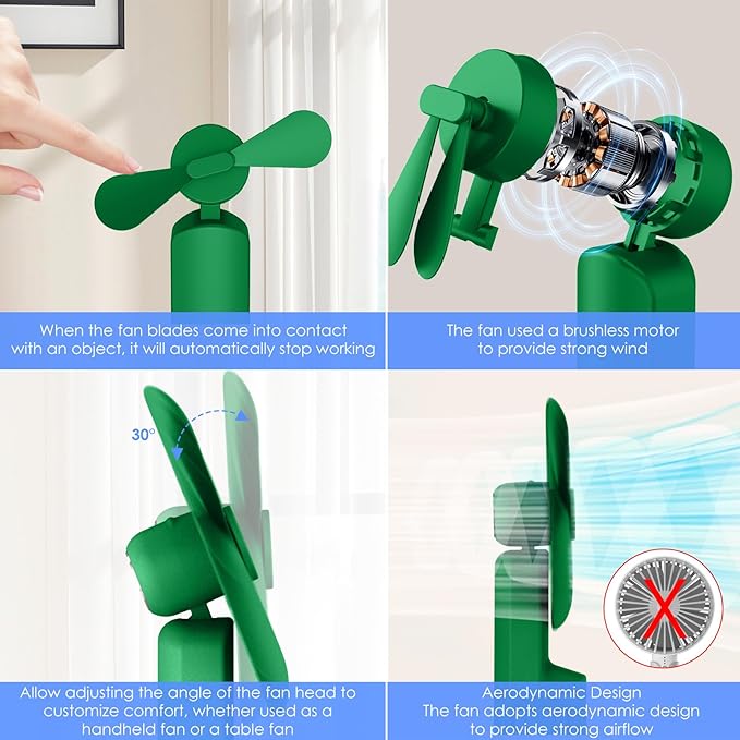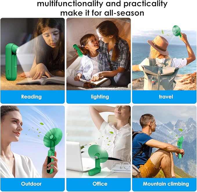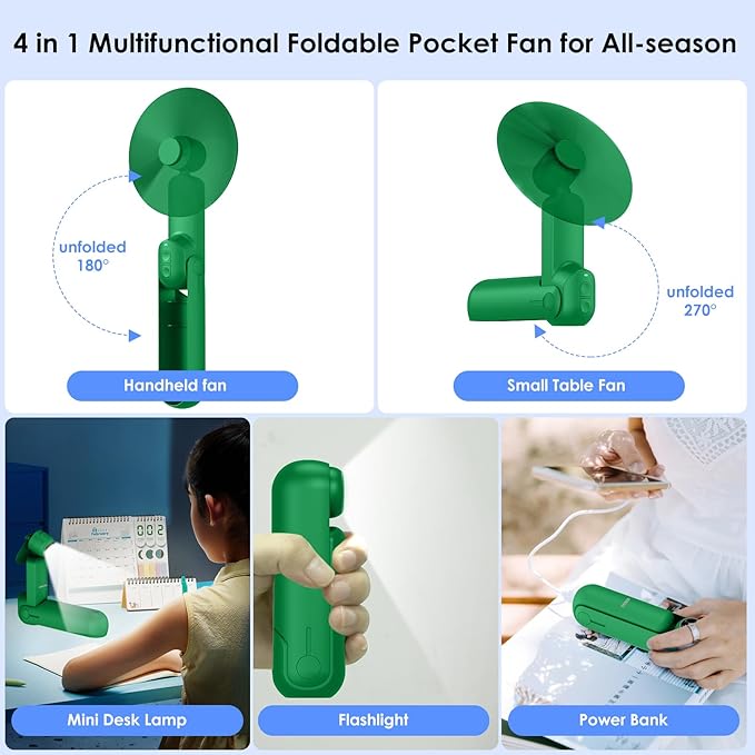 4 IN 1 Portable Handheld Fan,Personal Foldable Cooling Fan, Mini Pocket Fan,Desk Fan,Hand Fan,Flashlight,Power Bank,Table Lamp,Camping Travel Beach Fan, Birthday Gifts for Women Men(Green)