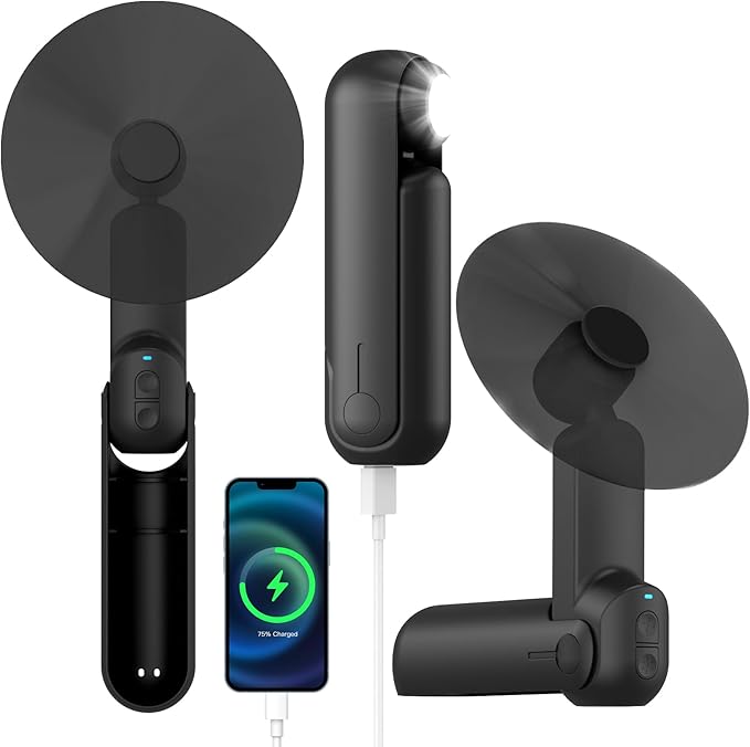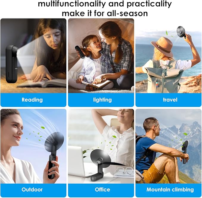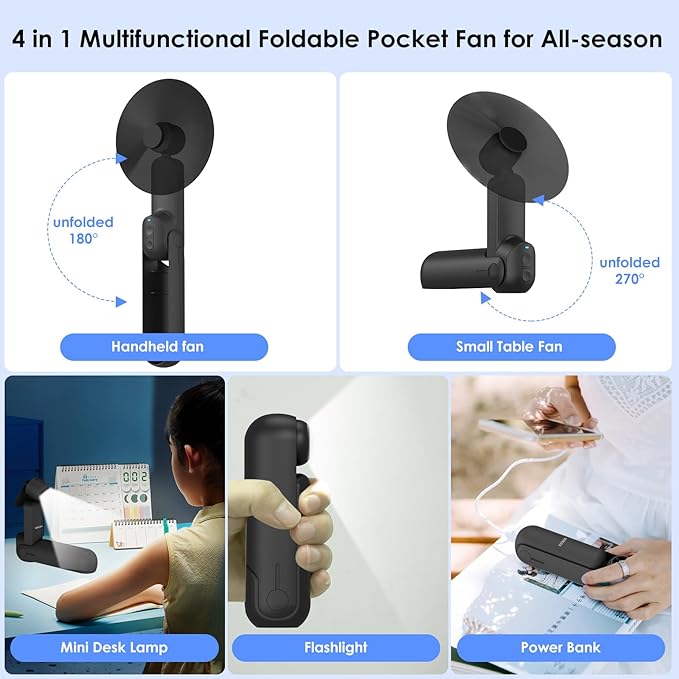 - 【4-in-1 Handheld fan】This 4 in 1 multifunctional handheld fan can be used as a power bank, flashlight, small desktop fan, and mini desk lamp. The aerodynamic design allows it to provide stronger wind,the folding design makes it very fashionable and easy to carry,it's a must-have for both home and travel.
