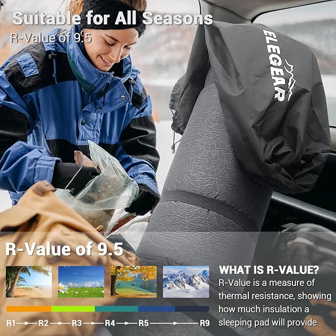 - 【 Durable Camping Material& No Noisy】- Enjoy sleeping in quiet comfort with the Elegear Insulated Sleeping Pad. Made from durable 50D elastic knit fabric, it offers breathability, moisture-wicking, thermal insulation, and tear resistance. Our inflatable camping pad is covered in thick waterproof TUP material, preventing punctures, moisture, and air leaks. Experience truly luxurious sleep, even in the harshest environments!