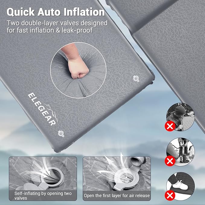 - 【Upgraded Air Valve for Camping Sleeping Pad】- The valve on the Elegear self-inflating camping pad has undergone enhancement. Open the first layer of the two valves while maintaining the seal on the second layer. In this setting, air can only be expelled and is prevented from entering, facilitating a more efficient air expulsion process. The improved sleeping mat is now more convenient to store, leading to a reduced volume compared to its previous version.