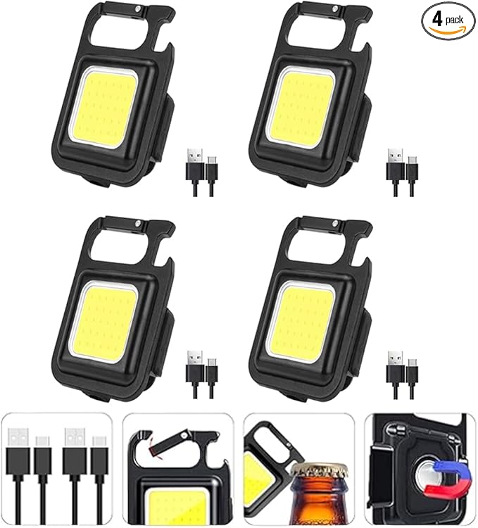 4Pack Keychain Work Light - Compact, Rechargeable, Ultra-Bright, with Carabiner, Magnetic, Adjustable Stand, Tripod - Perfect for Outdoor, Work, Emergency Use (4) pcs
