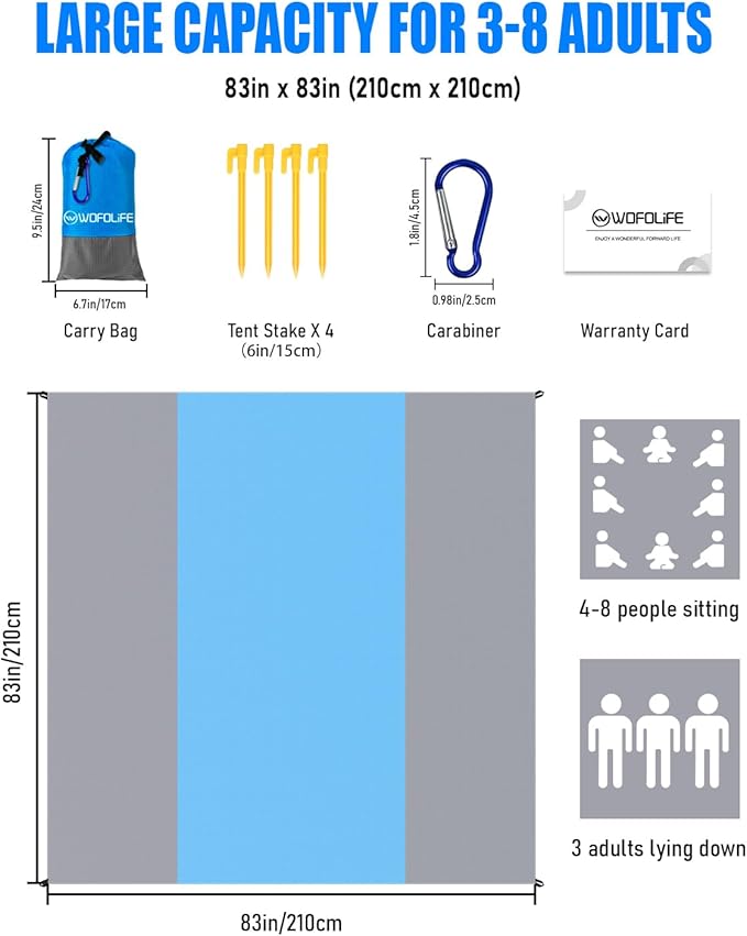- SPACIOUS DESIGN FOR UNMATCHED COMFORT: Spanning an expansive 83" x 83", our beach blanket offers ample room for 3-8 individuals, ideal for family outings. Complete with 4 stakes, 1 carabiner, and a convenient carry bag, it's the quintessential companion for seaside excursions.