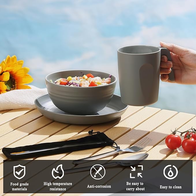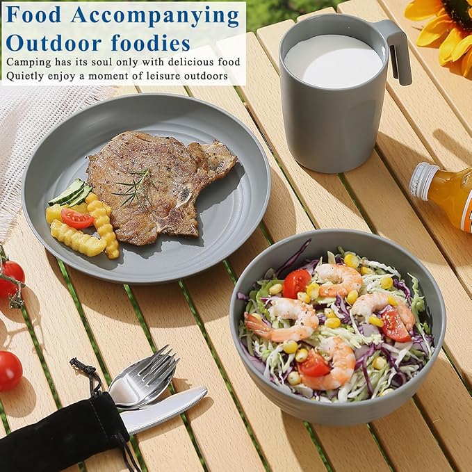 - HIGH QUALITY: The plates and cups of this camping set are made of pp material, BPA free, non-toxic and odourless. They are lightweight, unbreakable and sturdy, the stainless steel cutlery is made of high quality stainless steel, sturdy and durable.