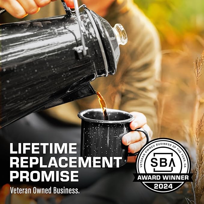 - LIFETIME REPLACEMENT PROMISE: Top materials & workmanship enable a superb promise. Shop with confidence. This is the last camping coffee pot you will ever need. US-based