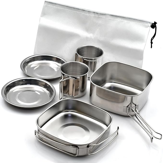 Backpacking Camping Cookware Mini Picnic Camping Cooking Mess Kit, Stainless Steel Pots Pan Plates Set for Hiking, Backpacking, Bushcraft and Picnic, Camping, Included Carry Bag