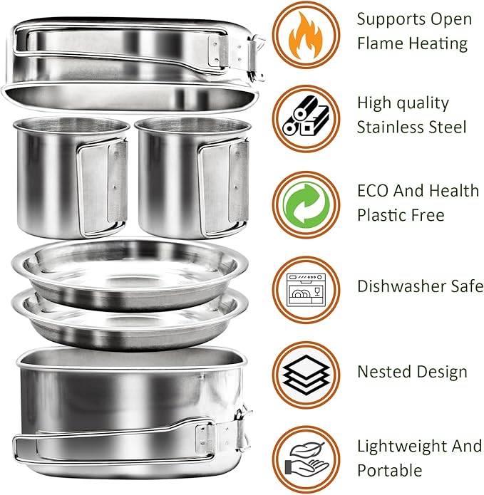 - 🏕️LIGHTWEIGHT & PORTABLE: Portable Stackable Mess Kit, With Folding Handle Design and Compact Size, Easy to Take and Save Your Space. The Pots, Pans, Plates, and Cups Stack Neatly Together, The Included Carrying Bag Ensures Convenient Portability.
