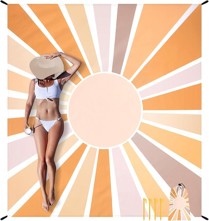 Beach Blanket Waterproof Sandproof, 10'X 9' Extra Large Oversized Beach Mat for 2-8 Adult, Quick Drying Lightweight & Compact Polyester Picnic Blankets for Outdoor, Travel, Camping, Hiking-Boho Sun