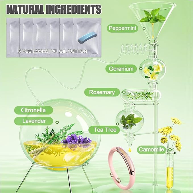 - The mosquito repellent bracelet contains natural plant extracts such as peppermint, geranium, rosemary, tea tree, camomile, citronella and lavender essential oil as effective ingredients. Deet-free, non-toxic and safe for adults, kids and pregnant women.