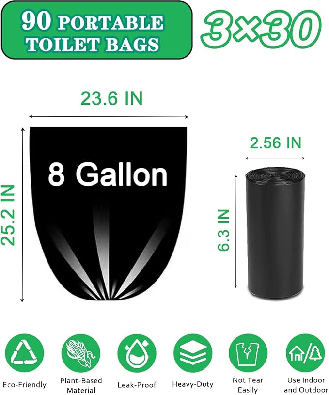 - Thickened and Durable🚽: Our potty bags for portable toilets are 8 gallons capacity, with a size increased to 25.2in x 23.6in, porta potty bags to thickened design, with strong toughness that can be pulled at will, durable, puncture-resistant features, a strong load-bearing load of up to 11-15LB, opaque, biodegradable, no odor, no drip, soft touch, and other advantages.