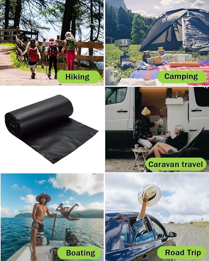 - Easy to Use🚽: Biodegradable poop bags camping in a very small size, will not take up too much of your space. You can easily carry toilet bags in your backpack. You just need to store the camping poop bags in a cool and dry place, put them on your portable toilet when you use them, and bury them in the soil when you are done.