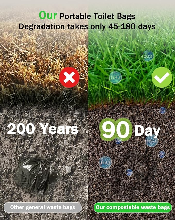 - 90 Portable Toilet Bags🚽: There are 90 toilet bags inside, divided into 3 rolls, each roll has 30, enough to meet your needs. Camping toilet bags are composed of natural corn plant starch, which is biodegradable and compostable and can be internally decomposed into the soil in 45-180 days, making them safe and environmentally friendly to use.