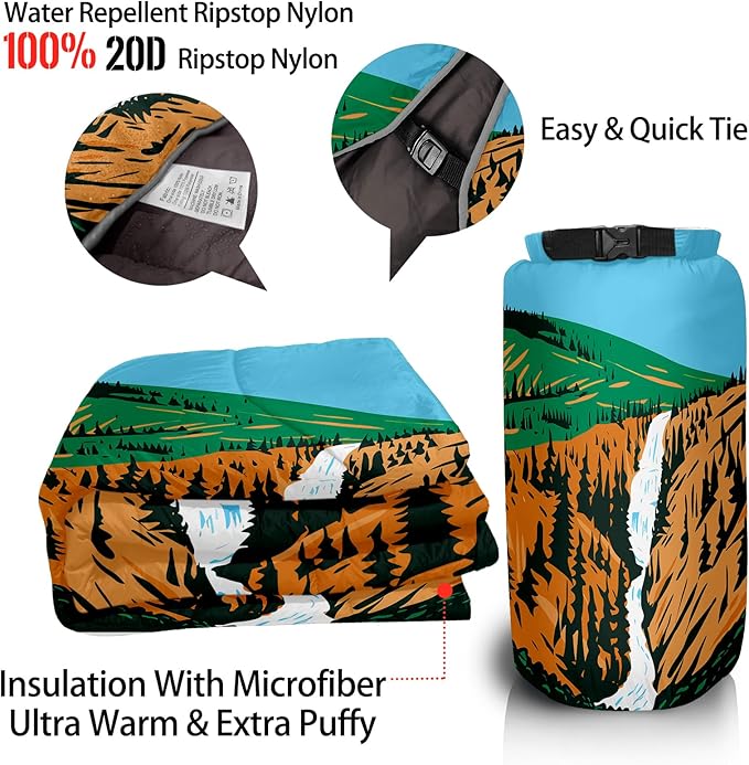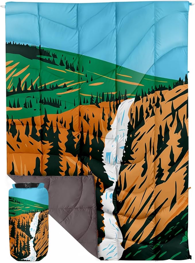 Outdoor Puffy Camping Blanket, Lightweight Down Alternative Puffy Printed Camping Large Ultra Warm Hammock Top Quilt Waterproof Blanket for Traveling Picnic Beach Party Cold Weather (Waterfall)