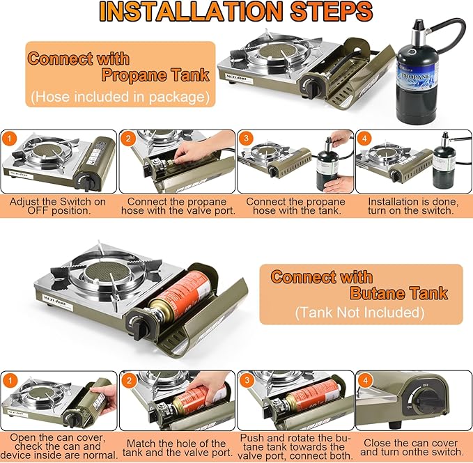 - 🔥Dual Fuel Camping Stove:MOZODAWN dual gas fuel stove is compatible with both butane and propane fuel canisters, and you can easily connect a propane tank to the camp stove using our propane hose.Can meet your different fuel needs.