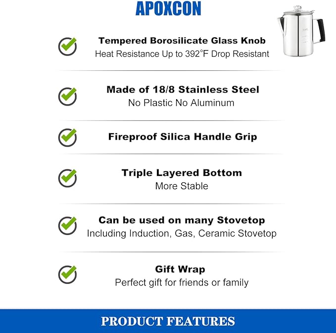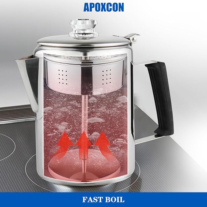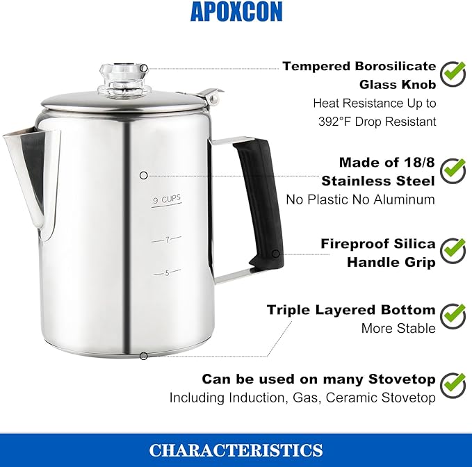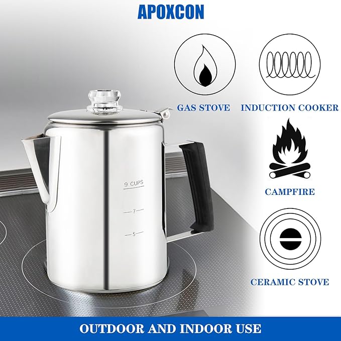 - OUTDOOR AND INDOOR USE --- This coffee percolator is designed for outdoor and indoor use. It’s suitable for induction cooker, ceramic electric stovetop and gas stovetop, as well as grills and campfires.