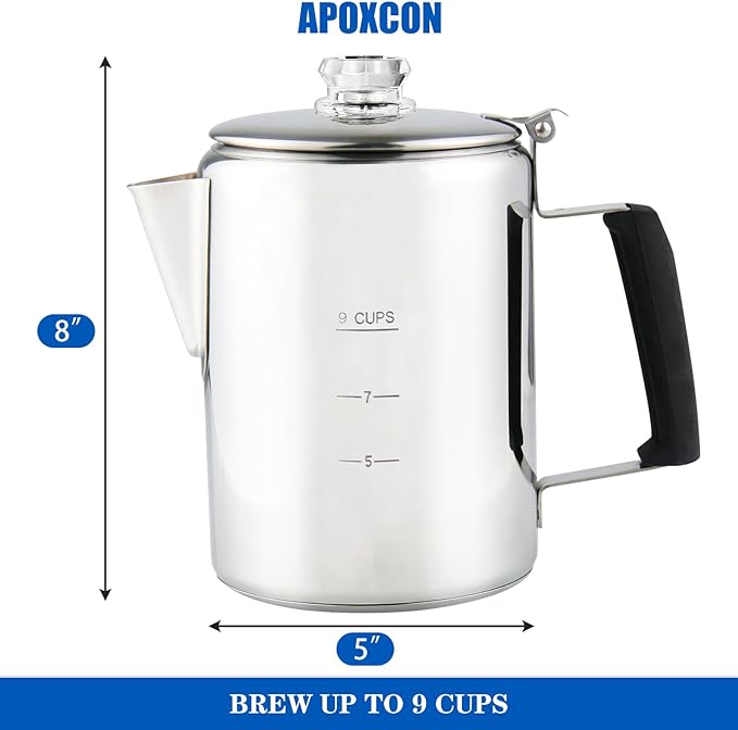 - COMPACT AND PORTABLE --- This coffee percolator pot can hold up to 9 cups of coffee. The compact structure makes the coffee pot very easy to carry. Whether camping or enjoying coffee at home, this coffee percolator is always at your service.