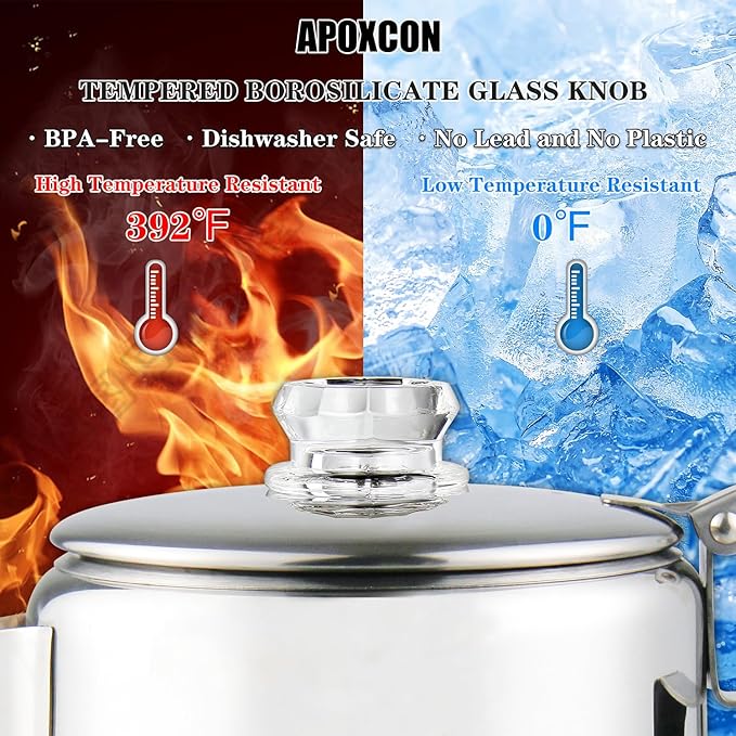- HEAT RESISTANT GLASS KNOB TOP --- The knob top is made of heat resistant high borosilicate glass, which is safer than plastic material. No Lead and No Plastic. The glass knob can withstand temperatures of 392°F, making it reliable and safe to use. Clear glass knob top lets you view your coffee while it’s brewing.