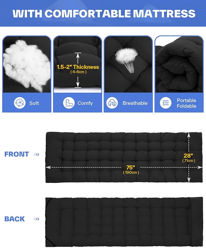 - Comfortable Mattress: Sportneer Camping Cot with mattress, soft pad add extra comfort, you can sleep more comfortably in this portable foldable bed for camping. In summer, the camping cot for adults can also be take away to increase the breathability.