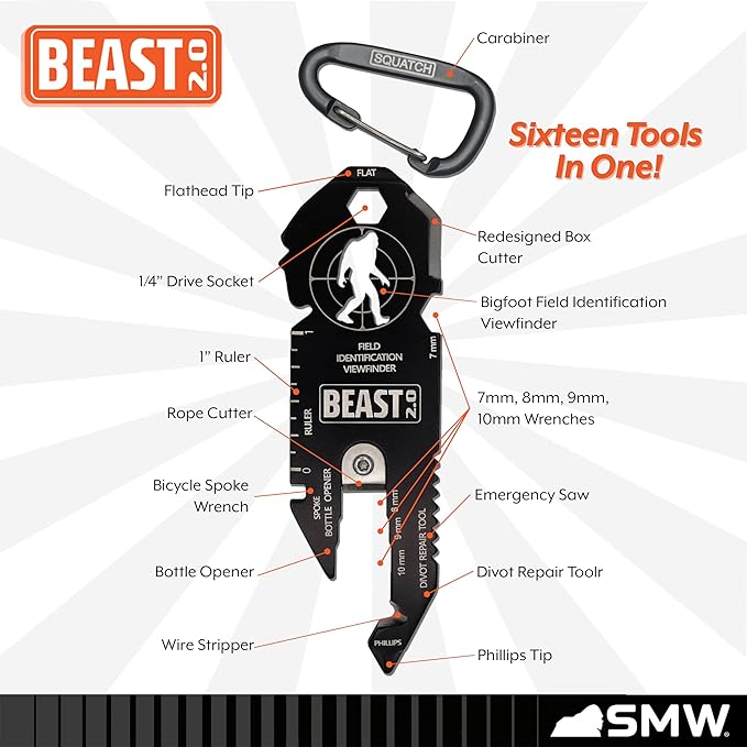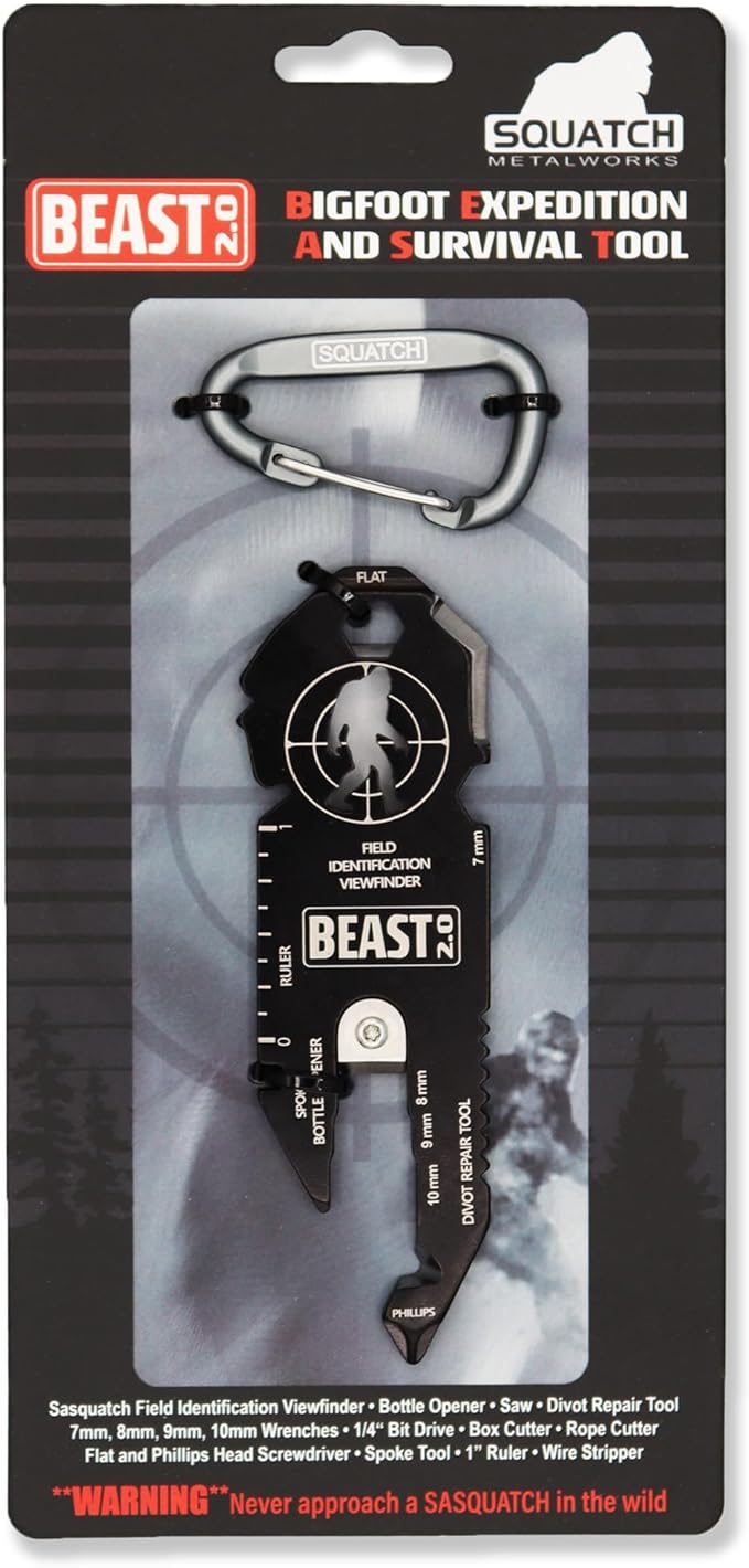 BEAST (Bigfoot Expedition and Survival Tool) Multi-Tool & Bottle Opener, Bigfoot gift for fans of Sasquatch, Yeti, Camping, Hiking - With Screwdriver, Wrench, Carabiner, Box Opener (BEAST 2.0 & BRUTE)