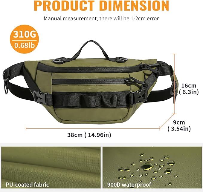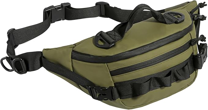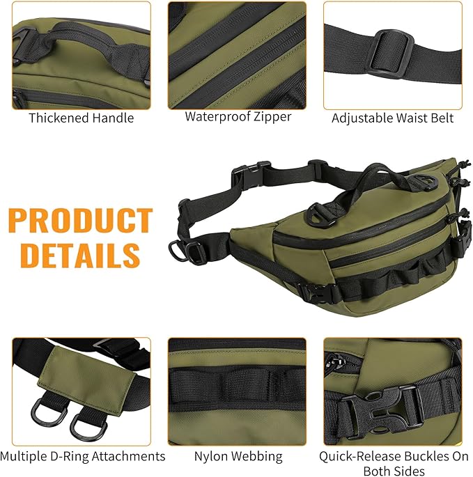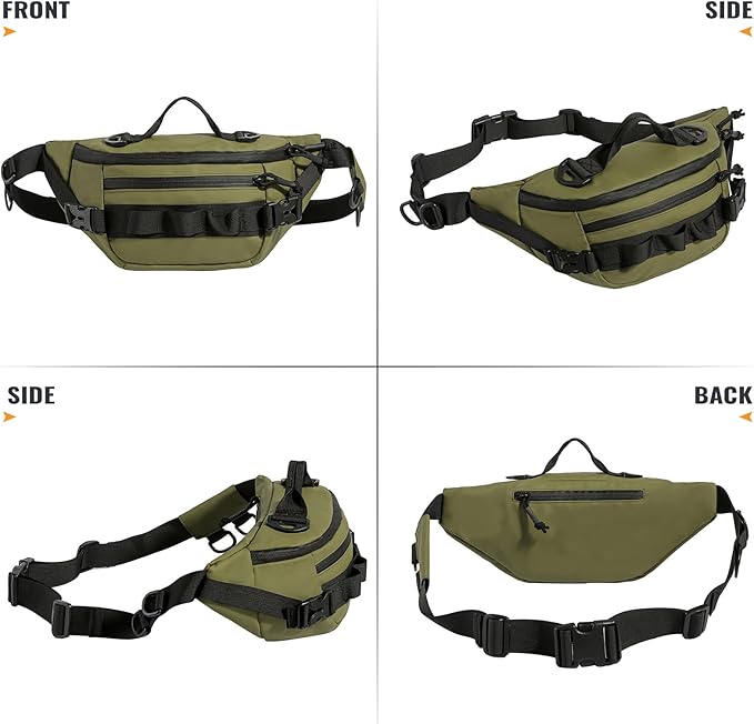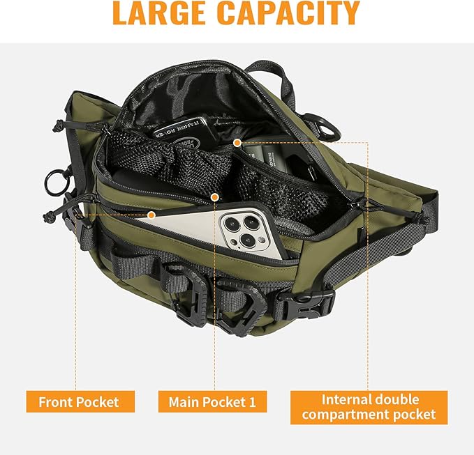 - 🔘 MOLLE DESIGN -- The tactical fanny bag adopts MOLLE external expansion system on the front side, you can load additional pockets, water bottle pocket, fishing accessory kits and other tactical utility/gadget accessories.