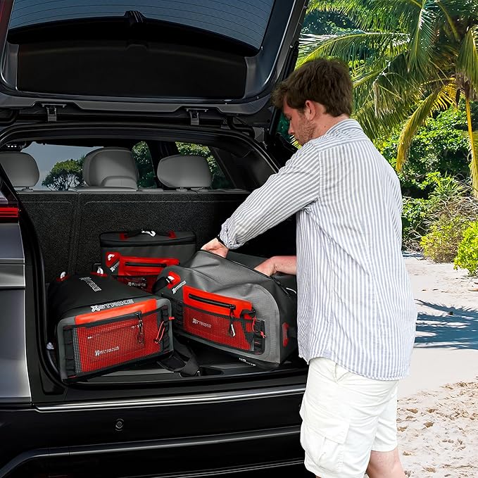 - Large Capacity and Multiple Pockets: The 34-liter waterproof canvas bag features an easily accessible main compartment, providing ample space for luggage and gear. It includes an easy-to-reach open mesh front pocket, a zippered mesh pocket on the inside of the front panel for small accessories, and a waterproof transparent small pocket for easy identification. The design of all pockets facilitates the organization of your items.