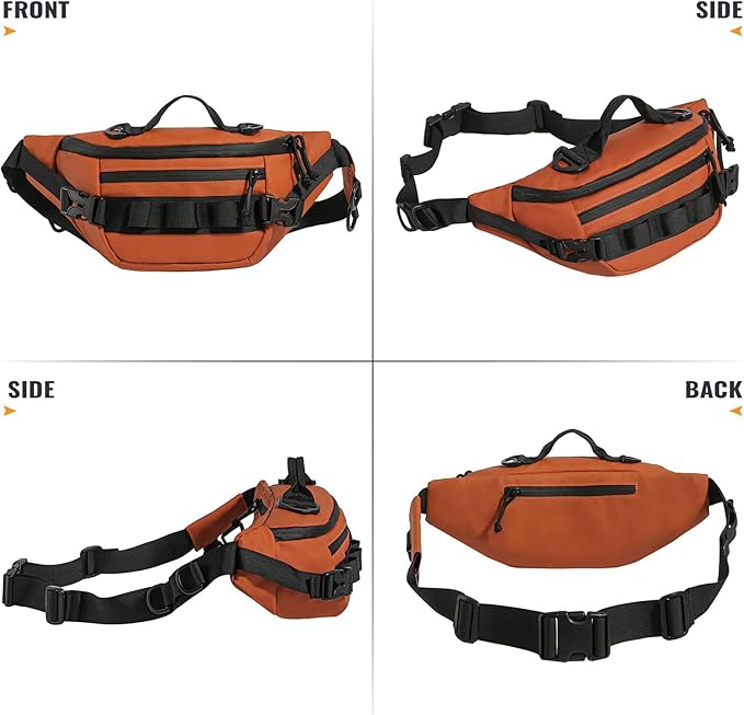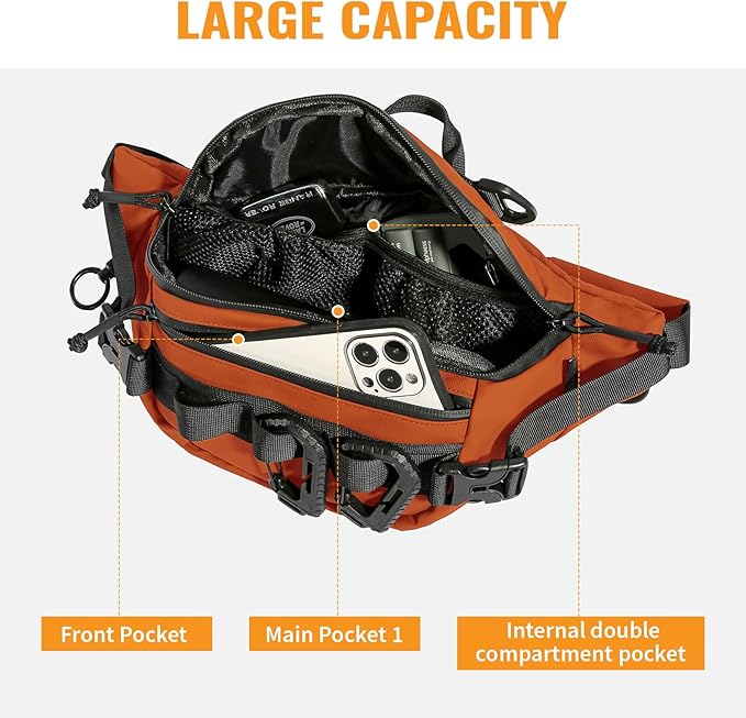 - 🔘 MOLLE DESIGN -- The tactical fanny bag adopts MOLLE external expansion system on the front side, you can load additional pockets, water bottle pocket, fishing accessory kits and other tactical utility/gadget accessories.