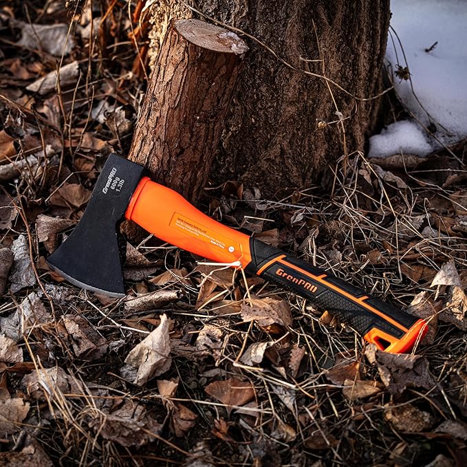 Hatchet Axe with Sheath, 15" Camping Hatchet for Wood Splitting and Kindling, Forged Carbon Steel Heat Treated Chopping Axe Handle with Anti-Slip Grip Orange